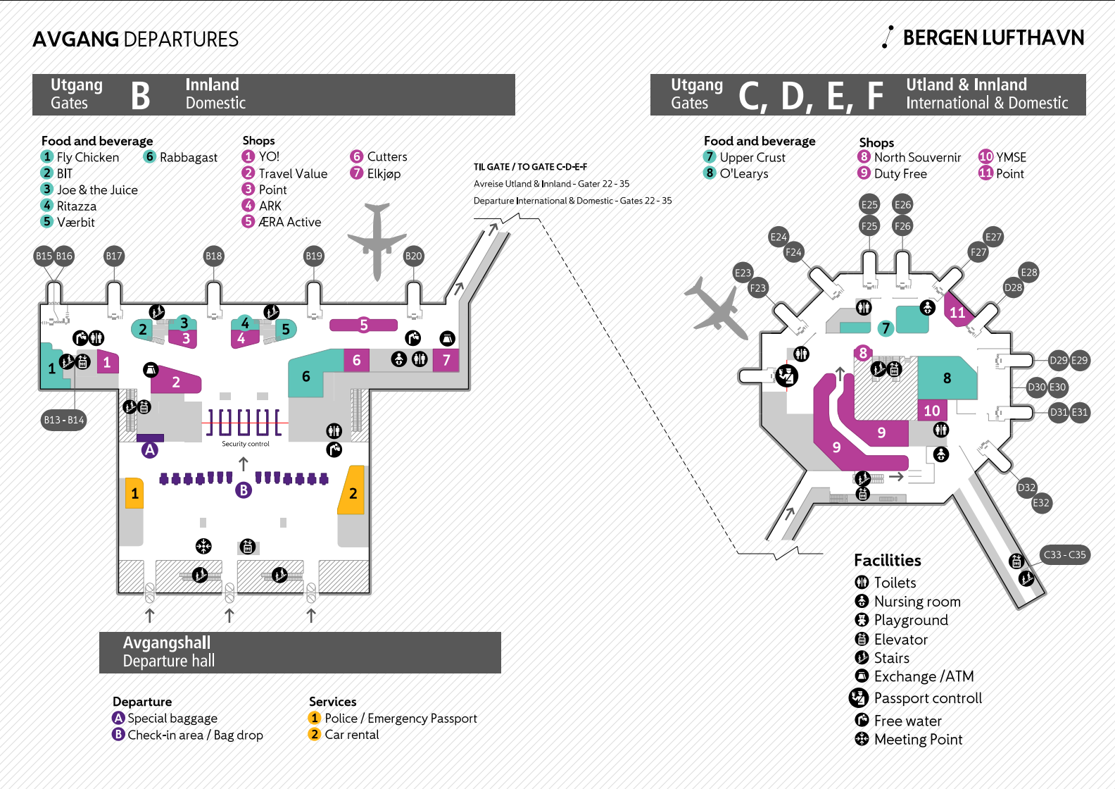 Kartet gir deg en enkel oversikt over terminalen. Du kan også se plassering av gater, butikker, serveringssteder, toaletter og andre servicetjenester.