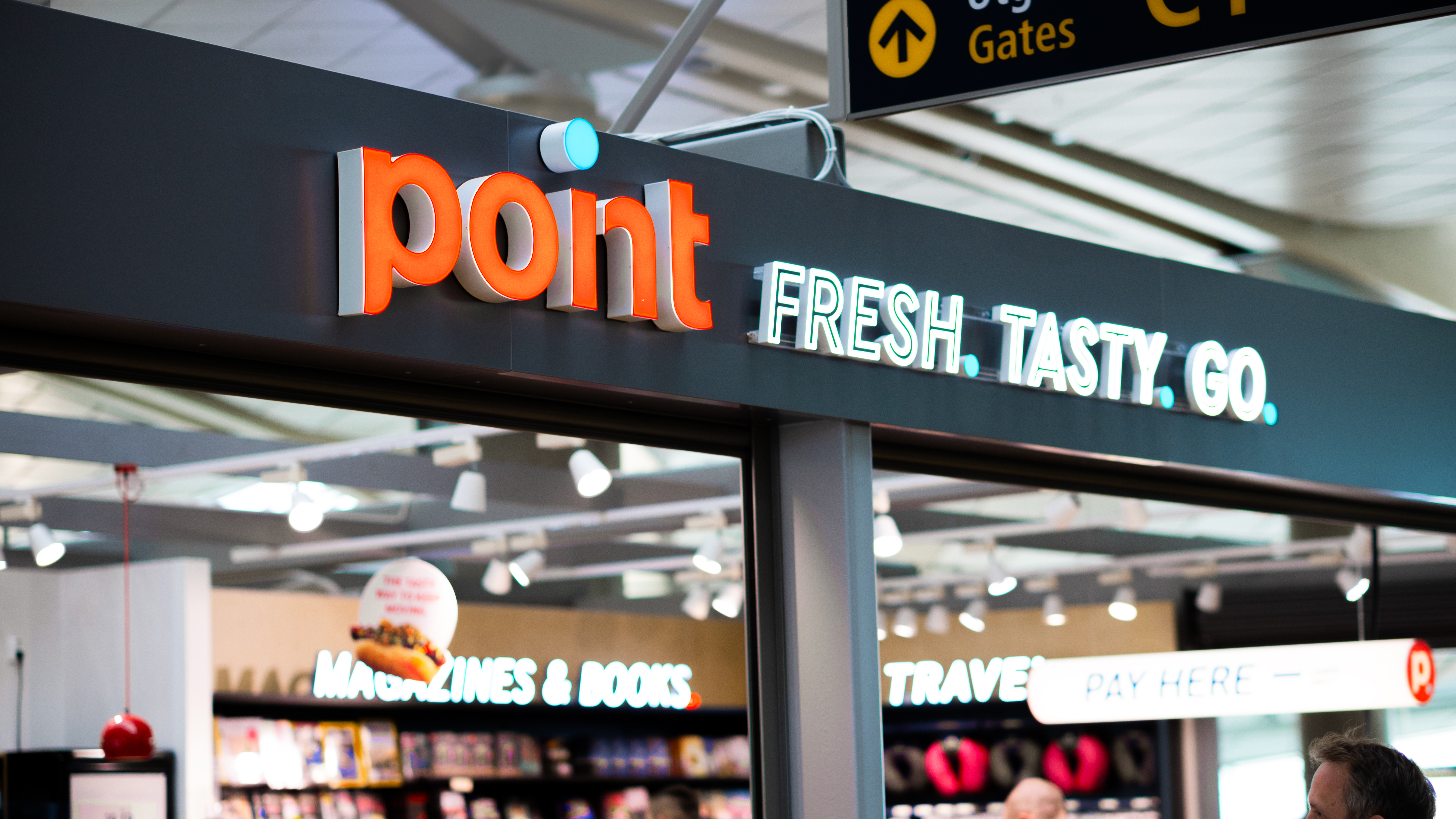 Skilt over butikk som viser teksten "point FRESH. TASTY. GO." i ein flyplassbutikk, med bokhandelseksjon i bakgrunnen